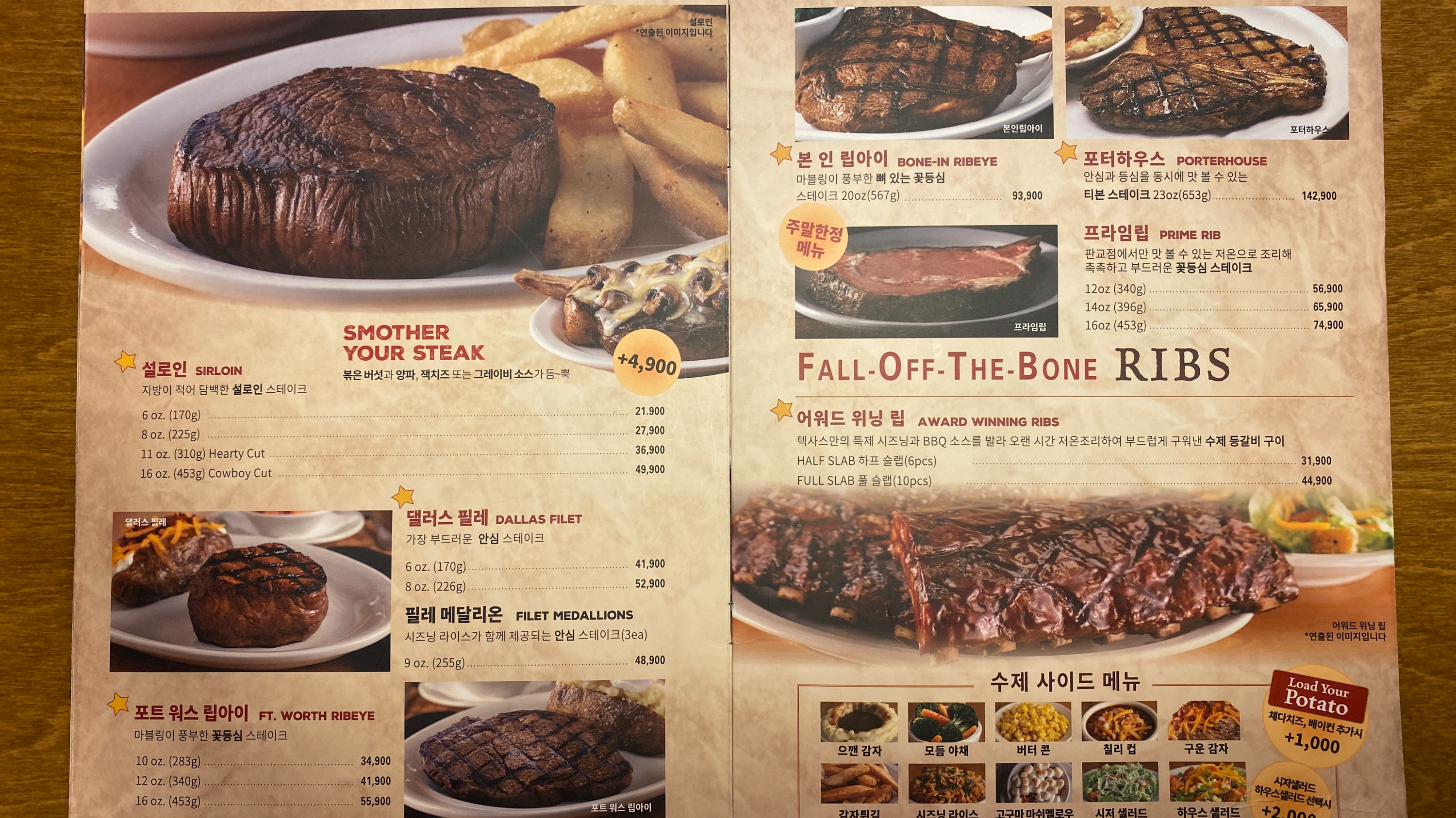 오픈하자마자 궁금했던 곳. 한눈에 봐도 패밀리 레스토랑인듯 분위기 혼자 들어가기 멋쩍은 식당. 고기가 너무너무 땡겨서 매장 앞에서 기웃기웃거리는 나에게 친절한 여자 직원분이 '혼자오셔서 스테이크 드시는 분 정말 많다'고 안내. 바로 입장. 후회 없이 혼자 먹기 잘한 스테이크. 정말 정말 정말 맛있다