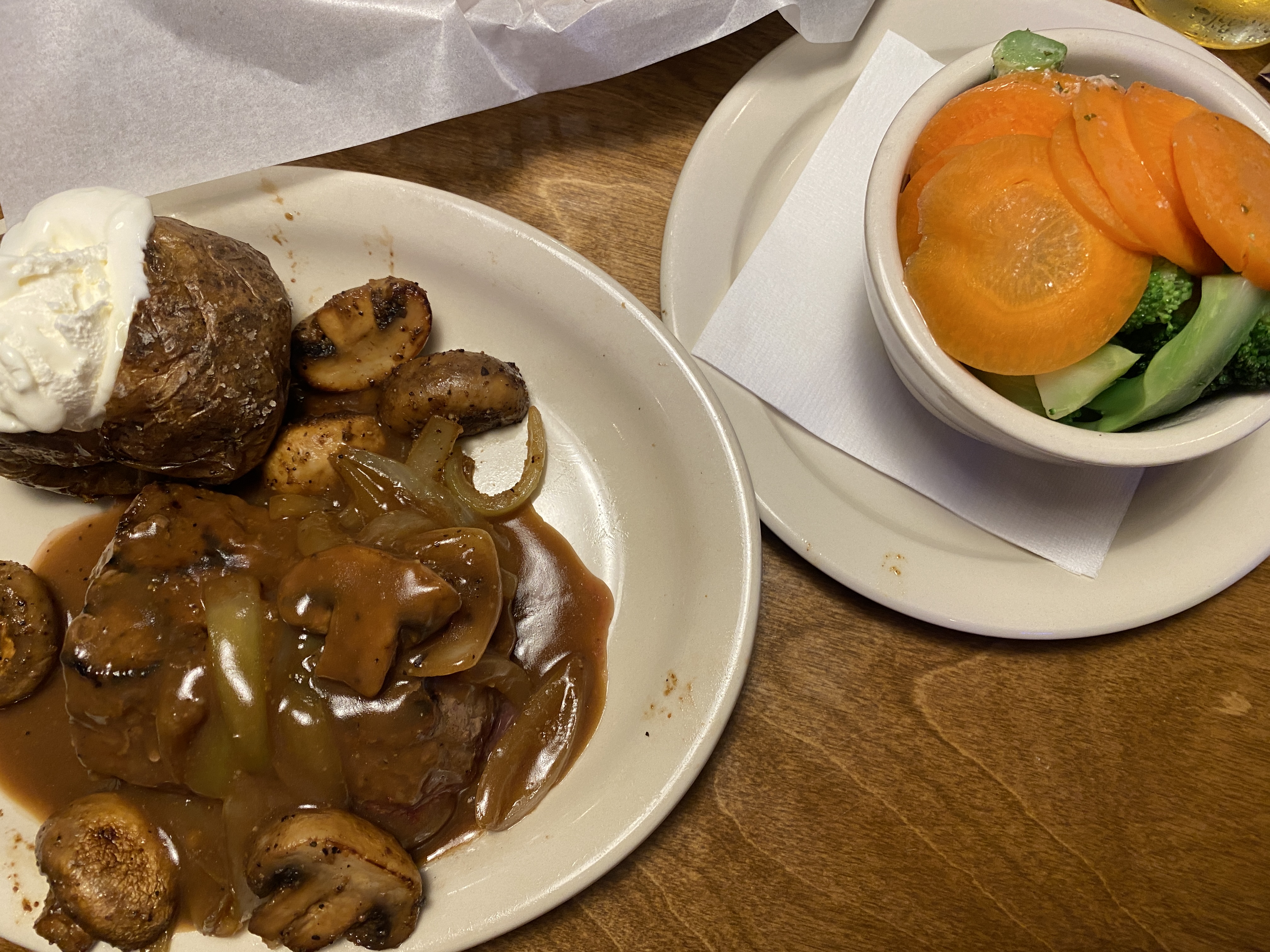 나는 오늘 서로인 6 oz + 으깬감자 + 모둠 야채를 주문 = 21,900원에 + 그레이비소스(볶은 양파와 양송이 버섯)=4,900원 +맥주